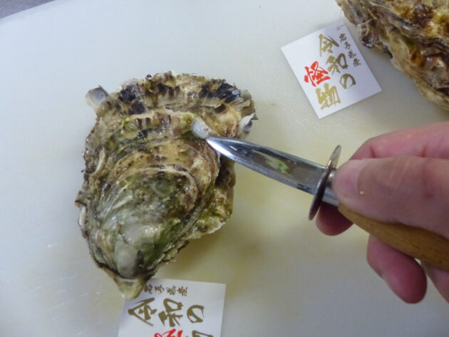 ここにある貝柱を狙って、オイスターナイフを差し込みます。