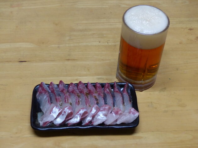 今回は、ボラの刺身で一杯やりました。
