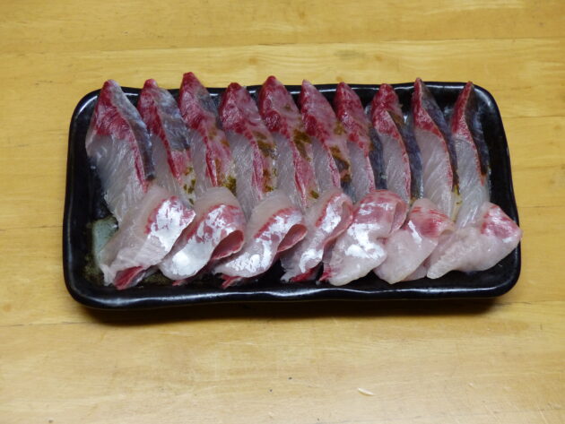 刺身になると色合いがいいので食欲をそそります。  上段は背中側、下段は腹側です。