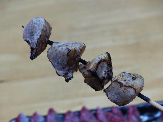 ボラといったら、そろばん(へそ=幽門)がお約束かも。  4等分にして串焼きにしました。