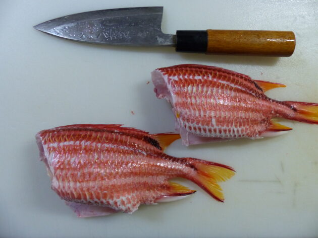 ウロコさえとってしまえば、あとは普通の魚のはずですが・・・  出刃は4寸半です。