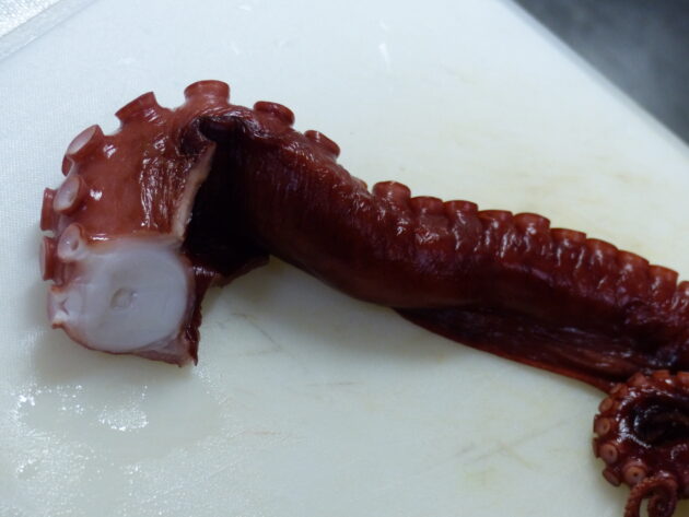 切っている最中のヤナギダコの足です。