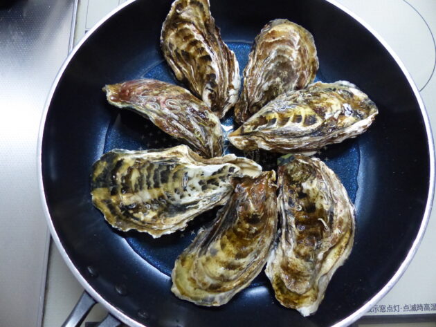 お腹が冷えそうになったので、7個を蒸しガキにしました。  酒を入れて蓋して5分くらいでOK!