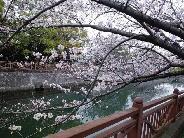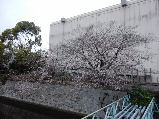 橋の上から振り返ると・・・今日の桜はこんな感じでした。