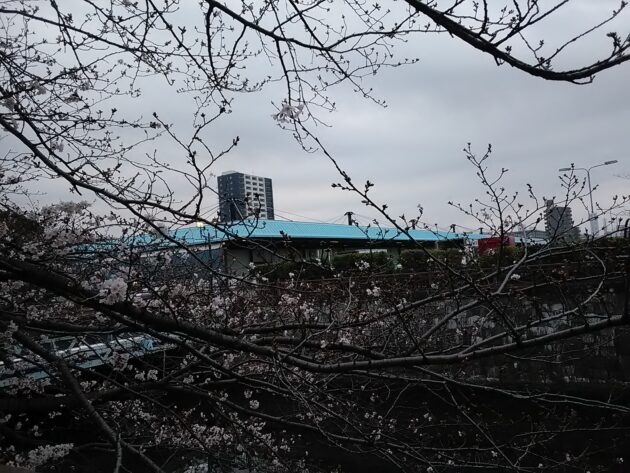 船橋市場は中央に海老川が流れていて、河川敷の桜はすでに花見シーズン!